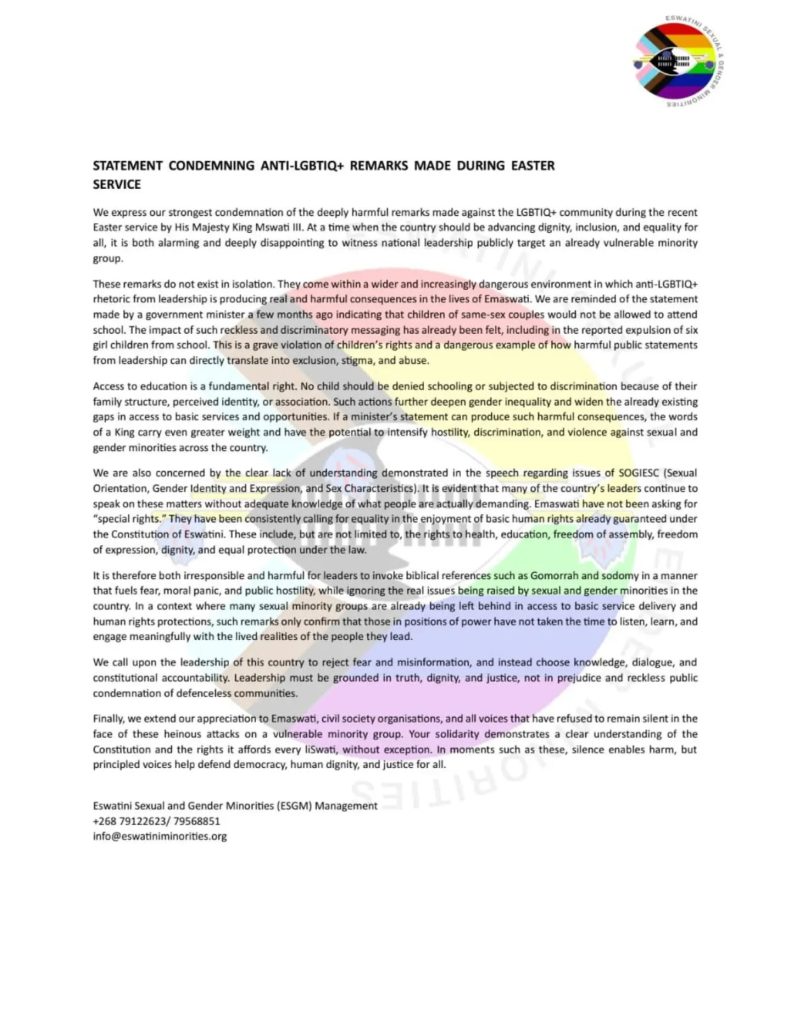 Eswatini Sexual and Gender Minorities (ESGM) statement condemning anti LGBTIQ + remarks made during Easter services. by Eswatini Minorities | Apr 10, 2026 | Uncategorized | 0 comments #InclusivityDiversityEqualityAccessibility #RegisterESGM #LIFT Submit a Comment Cancel replyYour email address will not be published. Required fields are marked *Comment * Name * Email * Website Save my name, email, and website in this browser for the next time I comment.